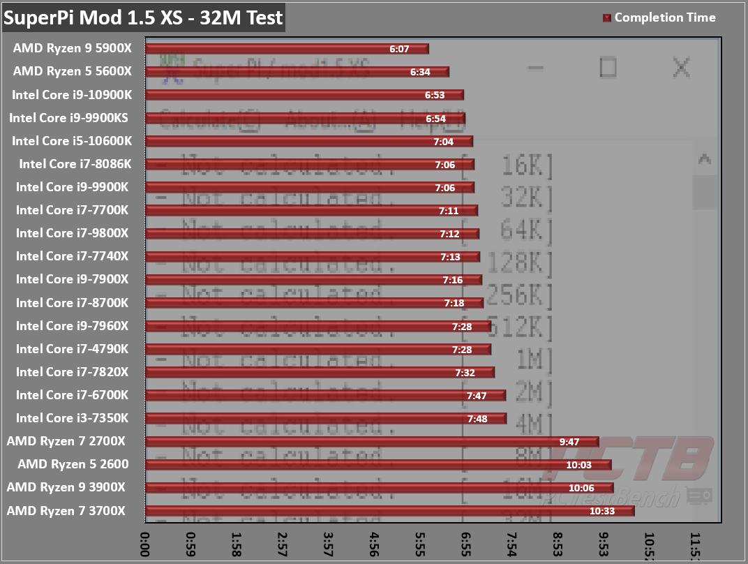 We tested using the built-in benchmarks to compute Pi to 1 Billion Digits in both single and multi-threaded mode and recorded the Total Computation time at the end of the run. Y-Cruncher is also able to take advantage of AVX512 instructions in compatible CPU’s. Due to the thermal load of running Intense AVX workloads, Intel has implemented an AVX offset clock that may scale the CPU’s clock speed back, even below stock speeds when running intense AVX loads. For this reason, we note the CPU’s clock speed in both single and multi-threaded test modes.