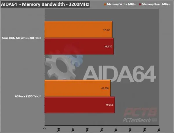 The Z590 Taichi scores a bit over 49GB’s for reads and a bit over 46GB/s for writes.