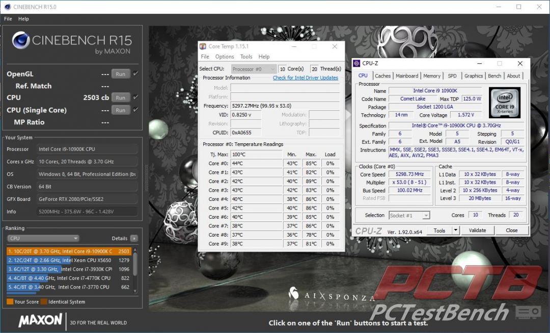 We tried pushing all cores to a manual clock speed of 5.2Ghz. Even though temps look really good, our score actually falls slightly from stock.
