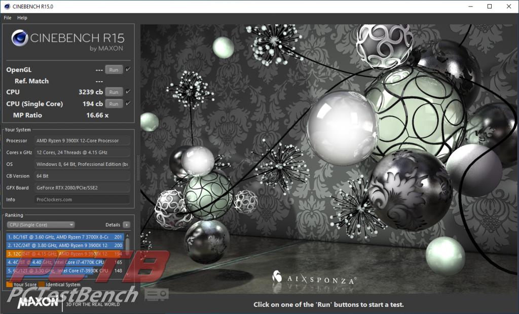 This gets us a new multi-core score of 3239 or a 3.6% increase over stock. Now, any time you start overclocking a 3rd gen Ryzen, it disables Precision Boost. For this reason, our Single thread clock speed is also 4.15Ghz and our score falls from 212 to 194.