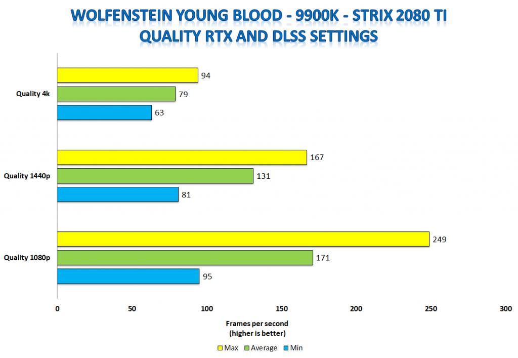 For Wolfenstein Young Blood, the recently added in both RTX and DLSS support. There are three different settings for RTX. These settings are Quality, Balanced and Performance. We tested all three resolutions, 1080p, 1440p, and 4K, on all three settings. With each of these settings we had Nvidia’s DLSS, or Deep Learning Super Sampling enabled. We also ran all RTX setting on both the 9700K and 9900K systems, with the Strix 2080 Ti.