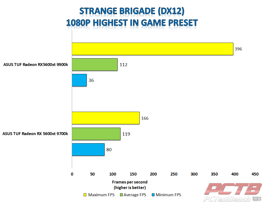 Strange Brigade was another example of the Vulcan API being a bit more stable than DX12. Strange Brigade had much higher minimum frame rates in Vulcan when compared to DX12. In 1080p, the ASUS TUF 5600 XT averaged 119 frames per second on the 9900k system and 125 frames per second on the 9700k system. In 1440p resolution, the TUF 5600 XT averaged 87 frames per second on the 9900k test bench and 90 frames per second on the 9700k test bench.
