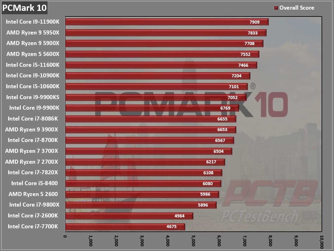 PCMark 10 replicates many common tasks an office user might do such as manipulating photos, video conferencing, and spreadsheet editing and the 11900K holds first place overall in our list, even against the latest AMD chips.