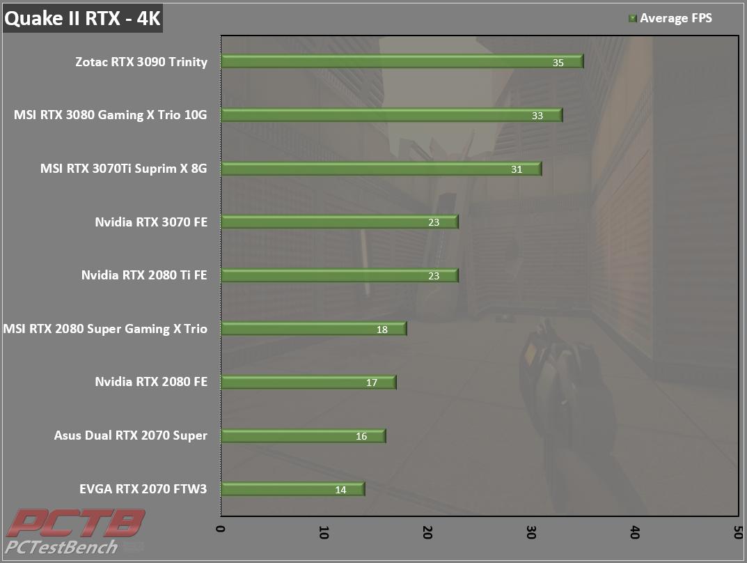 A classic with a brutal new engine, Quake 2 RTX chews up even the most powerful cards at 4K. We still managed a playable 31 FPS average, quite a jump over the RTX 3070.