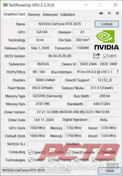 GPUz says the RTX 3070 Founders Edition can boost to 1725MHz, but we’ve already seen it hovering around the 2000MHz mark in our testing. Let’s see what more we can get out of it.