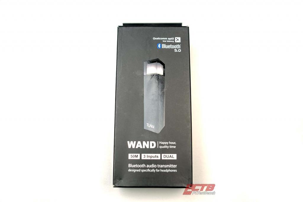 The front of the packaging has an image of the actual Tunai Wand centered with the Wand branding and the phrase Happy Hour, Quality Time. Printed directly below. Across the top, Tunai advertises a couple of the key features of the Wand. These features include Qualcomm aptX low latency and Bluetooth 5.0.